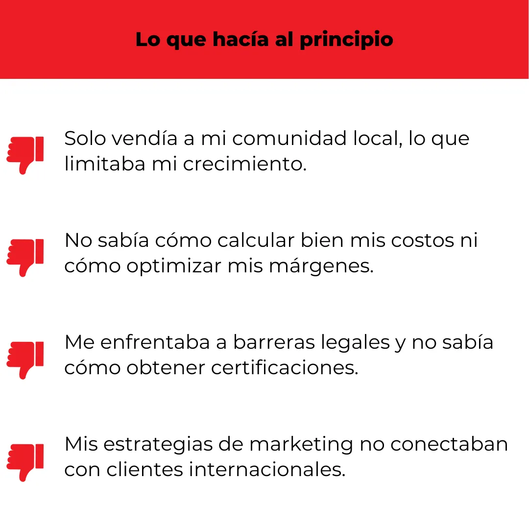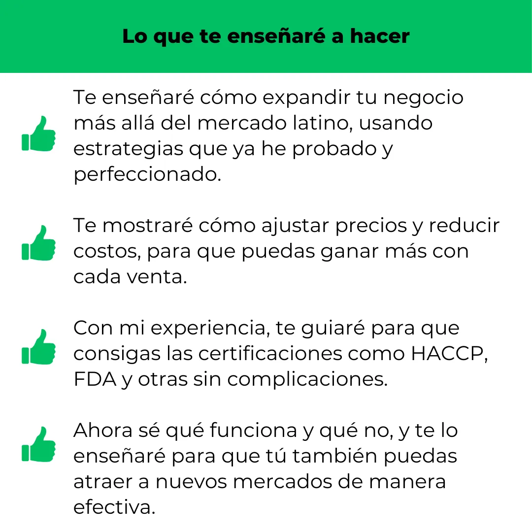 Este programa está diseñado para que tú también puedas recorrer un camino similar al mío, sin los errores que me costaron tiempo y recursos. Mi experiencia es la base sólida que te guiará en la expansión de tu negocio de comida latina a mercados internacionales.